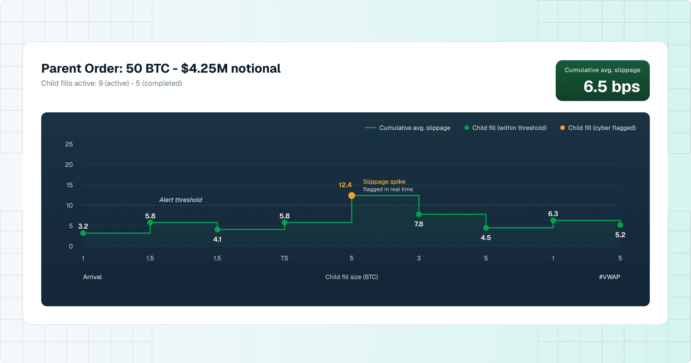 For large parent orders worked across multiple venues and price levels, we also track slippage dynamically in real time as the order executes. Execution quality on a large order isn't determined by the first fill. It can deteriorate across child fills if conditions shift, and catching that as it happens is fundamentally different from discovering it in a post-trade report